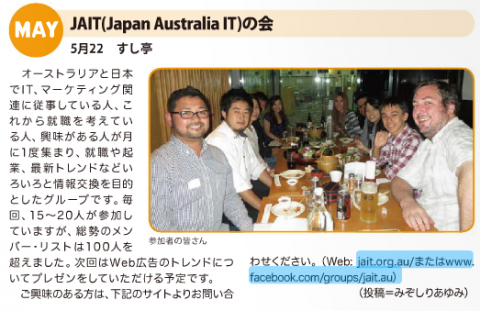 日豪プレスさんの2014年の6月号に、JAITの集まりが紹介されました。 これで新しいメンバーが増えるといいのですが、26日の集まりもすでに13名が参加予定です。 当日参加も増えるので、久しく20名くらい集まるのかと。。。期待してます。